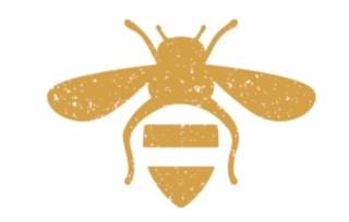The mark consists of a stylized depiction of a gold bee with a white distressed texture. The bee features two antennae, two wings, and a segmented body. The body includes two geometric shapes: a horizontal rectangle representing the midsection and a downward-pointing shield or triangle shape representing the lower body segment. The remaining color white represents background and is not a feature of the mark.