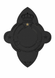 The mark consists of a black label design with a lined circular seal in the center, a pointed elongated top and bottom, and half circles extending from the left and right sides. The pointed elongated top includes a black crown, the pointed elongated bottom includes a decorative element in black, and each half circle on the right and left contains a black star. There is a gold star underneath the crown.