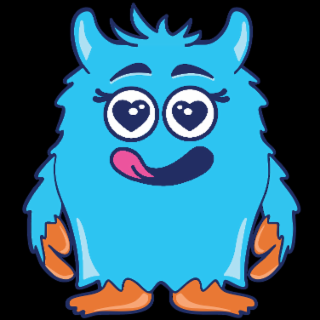 The mark consists of a light blue cartoon character resembling a furry creature with horns, brown feet and hands, large round dark blue and white eyes with eyelashes and heart-shaped pupils, and a dark blue mouth with a pink tongue featuring a licking expression. The character is outlined in dark blue. The black in the mark represents background.