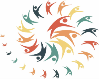 The mark consists of a series of human figures in the colors red, orange, yellow, green, and blue, arrayed in a spiral.