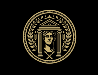 The mark consists of two concentric circles the center of which features the bust of a mandepicted as a classical statue between two columns topped with beams, forming a portico-likestructure with a triangular roof. Beneath the head is a cross patter comprised of two crossedswords. The pillars and structure feature olive laurels on either side that extend to the top of thecircle. Between the top of the laurels is a chevron with a four sided polygon on either side. Between the columns and the laurels are five pointed stars above a stacked chevron shape whichis above a circle. Between the concentric circles is a repeating pattern of three dashes. The aforementioned appears in gold on a black background.