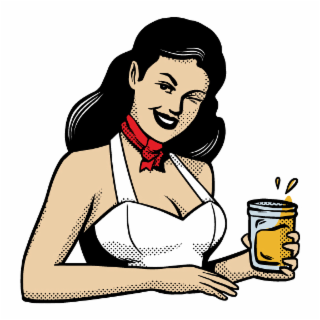 The mark consists of the front-facing image of a woman from the waist up smiling and winking, the woman having black hair with white highlight, beige skin on her face, neck, arms and chest outlined in black, with her ear, eyebrows, eyes, nose and lips highlighted in black, with white teeth, with a red bandana around her neck outlined in black, wearing a white halter top with shoulder straps outlined in black, her left arm with beige skin outlined in black with her hand holding a mason jar in gray, outlined in black, with gold beer appearing in the mason jar also outlined in black, with her right arm with beige skin outlined in black crossing in front of her body so as to appear that it is is resting on a ledge, with small black dots appearing throughout the image to suggest shading.