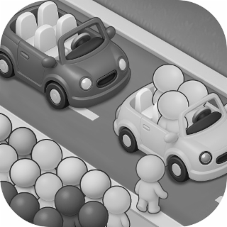 The mark consists of two cars driving on the street with people waiting to board. There are three people in the first car, and no one in the second car.