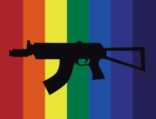The mark consists of a design consisting of a silhouette of a black firearm positioned over background consisting of seven vertical rectangles appearing in the colors of the rainbow, namely, red, orange, yellow, green, blue, indigo, and violet.