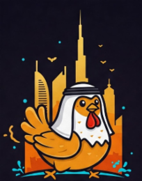 The mark consists of a chicken wearing a head covering in front of a city skyline.