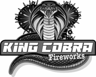 The mark consists of A stylized drawing of a King Cobra snake in a coiled position with stylized firework bursts in the background on both the left and right side of the snake's head and in the foreground of the snake the words "KING COBRA Fireworks" with "KING COBRA" placed inside a rectangular box and the word "Fireworks" positioned below the word COBRA and overlapping both the snake's tail and the rectangular box at a slight diagonal.