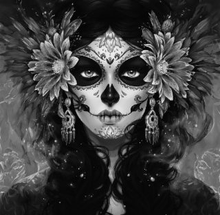 The mark consists of an illustrated bust of a woman facing forward with a Mexican Day of the Dead face painting on her face, flowers in her hair, and wearing earrings. The background features abstract swirls and dots.
