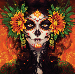 The mark consists of the bust of a woman facing forward with a Mexican Day of the Dead face painting on her face, black and dark brown hair, beige skin with white and dark accents, eyes in white, yellow, orange, red and black, black eyelashes, dark brown eye sockets outlined in orange with small flower designs in green, red, orange along the edges of the eye sockets, a flower design in orange, yellow and red on the chin and on top of the forehead, swirl shapes in green, red and brown in the middle of the forehead and below the eye sockets, a black skeletal nose with green and red petal designs on each side of the nose, red lips with white shading, black stiches extending from the center of the mouth to the ears. The woman is wearing chili pepper earrings in red, green and yellow, and flowers in yellow, orange, red, brown and green colors in her hair. The background features swirl designs and dots in red, orange, yellow and green.