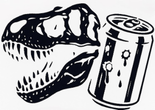 The mark consists of A t-rex scull adjacent to a can; wherein the can has bullet holes in the side of the can and liquid is dripping out through the bullet holes.