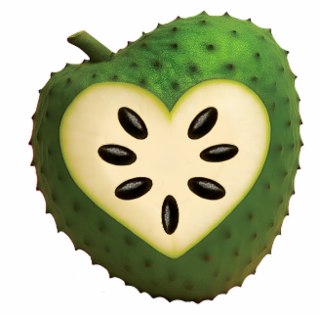 The mark consists of a green spiky fruit shaped like a heart with its front section cut open to reveal a cream-colored interior in the shape of a heart, containing seven oval black seeds arranged symmetrically.