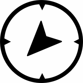The mark consists of a black circle with triangles pointing to the center of the circle, the triangles located at 12, 3, 6, and 9 o'clock, and an arrowhead located in the middle of the circle, pointing to the lower left of the circle between 7 and 8 o'clock.
