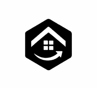 The mark consists of a hexagon containing a stylized house silhouette comprised of an inclined rooftop, window, and a curved arrow.