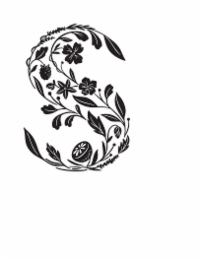 The mark consists of The letter "S" formed by botanical elements including lavender sprigs, wildflower leaves, cosmos flowers, jasmine blossoms, sage leaves, juniper berries, rose buds, Japanese maple leaves, orange fruit, mint leaves, eucalyptus leaves, evening primrose blossoms, blackberries, climbing vines, and acorn leaves.