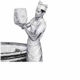 The mark consists of a man wearing an apron and hat, holding some cheese while standing by a cheese vat.