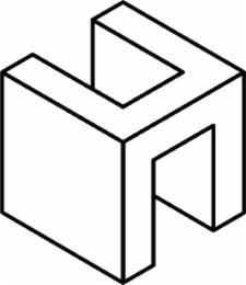 The mark consists of a stylized design of the letter “H” depicted in a three-dimensional geometric form with bold black lines. The design resembles a block-like, isometric rendering where the vertical and horizontal components of the letter “H” are formed by rectangular shapes outlined in black.