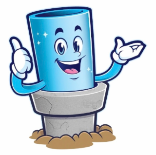 The mark consists of a cartoon character in blue, white, pink in the shape of a pipe coming out of a gray pipe, which is coming out of the brown ground.