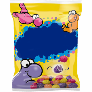 The mark consists of a three-dimension product packaging configuration comprising a yellow background with a dark blue oval cloud design inside a larger light blue oval cloud design surrounded by green, yellow, pink, purple, light blue and dark blue dots. Surrounding the top left of the composite cloud design are three stylized candy characters, the left-side character appears in pink, the right-side character appears in orange, and the bottom left side character appears in purple. The bottom of the design features a pile of several candy pieces, each in one of the following colors: purple, pink, orange, or yellow. Above the candy pieces is a stylized cross section design of a purple candy piece with curved purple arrows pointing to it on the right and left sides.