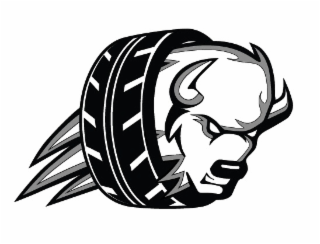 The mark consists of A buffalo head protruding from of a tire and three pointed features, each having multiple layers, protruding from the other side of the tire.
