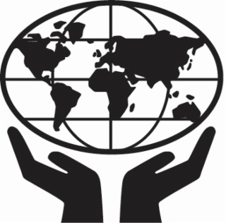 The mark consists of two outstretched hands with thumbs and the side of the hands visible holding a stylized design of a globe containing five continents.