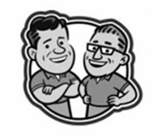 The mark consists of a depiction of two men, one with darker hair, the other with lighter hair with black lines and black glasses. Both depictions appear to be smiling and are wearing short sleeved collared shirts. The depictions are outlined in black and are set inside of a white banner with black outlining.