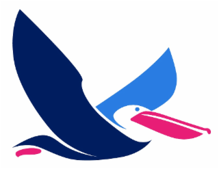 The mark consists of a soaring pelican with the body and one wing in navy blue, the other wing and eye in medium blue, and the beak and foot in dark pink.