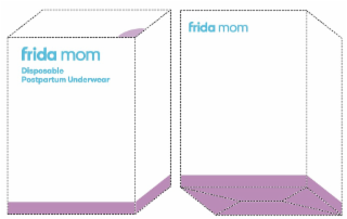 The mark consists of the three-dimensional trade dress packaging for the goods. The packaging design features a predominantly white background. The trade dress on the front panel includes the words FRIDA MOM DISPOSABLE POSTPARTUM UNDERWEAR in blue. At the bottom of the front panel is a horizontal purple band that wraps continuously around the side and rear panels at the base of the packaging. The top panel contains in the lower right corner a purple quarter circle. The rear panel displays FRIDA MOM in blue. The bottom panel is solid purple. The broken lines depicting the shape of the packaging indicate placement of the mark on the goods and are not part of the mark.