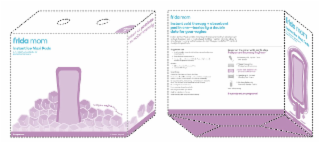 The mark consists of the three-dimensional trade dress packaging for the goods. The packaging design features a predominantly white background with blue and purple accent text and gray text, and pink, purple and gray graphic elements. The trade dress on the front panel includes the words FRIDA MOM INSTANT ICE MAX PADS 2-IN-1 ABSORBENT PADSICLES FOR POSTPARTUM RECOVERY in blue. Directly underneath these words is a stylized illustration of a maxi pad surrounded by ice cubes rendered in purple and pink. In the lower right corner of the front panel appears the phrase GET YOUR VAGINA ON THE ROCKS in purple. Underneath the image is a horizontal purple band that appears at the bottom edge and wraps continuously around the side and rear panels at the base of the packaging. On the front panel, the band includes the words POSTPARTUM and 8 INSTANT ICE PADS in white. The top panel contains in the lower right corner a purple quarter circle that includes the words STEP 3 in white. The right side panel contains the words INSTANT ICE PADSICLES – NO RECIPE REQUIRED at the top in purple, and further pink and purple ice cubes at the bottom. The rear panel is organized horizontally with a blue segment of text at the top featuring the words FRIDA MOM and other text about the product. Directly underneath that blue segment is gray text describing product features and use. Directly underneath that is a horizontal line, followed by the words SUGGESTED USE, and text about the suggested use of the product, CONTAINS, and text about what the product contains, and CARE + SAFETY, and text about product care and safety, all in gray. On the right side of rear panel appear the words LAYER ON RELIEF WITH OUR 5-STEP in gray. Underneath that appear the words POSTPARTUM RECOVERY REGIMEN* in purple. Underneath that appear five vertically-oriented images displaying the 5-step regimen, namely, a peri bottle image with the words 1. CLEANSE WITH UPSIDE DOWN PERI BOTTLE, in gray, an underwear image with the words 2. WEAR DISPOSABLE POSTPARTUM UNDERWEAR, in gray, a maxi pad image with the words 3. CHILL AND ABSORB WITH INSTANT ICE MAXI PADS, in purple, a pad liner image with the words 4. SOOTHE WITH PERINEAL COOLING PAD LINERS, in gray, and a foam dispenser image with the words 5. RELIEVE PAIN WITH PERINEAL HEALING FOAM, in gray. Directly underneath the 5-step regimen appear the words *EACH SOLD SEPARATELY in gray and BE POSTPARTUM PREPARED in purple. On the left side panel appear the words FRIDA MOM INSTANT ICE MAX PADS 2-IN-1 ABSORBENT PADSICLES FOR POSTPARTUM RECOVERY in blue, as well as a popsicle image in purple and pink. In the purple band at the bottom edge of the left side panel appear the words POSTPARTUM and 8 INSTANT ICE PADS. The bottom panel is solid purple. The broken lines depicting the shape of the packaging indicate placement of the mark on the goods and are not part of the mark.