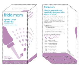 The mark consists of the three-dimensional trade dress packaging for the goods. The packaging design features a predominantly white background with blue and purple accent text and gray text, and pink, purple and gray graphic elements. The trade dress on the front panel includes the words FRIDA MOM UPSIDE DOWN PERI BOTTLE THE MOMWASHER FOR POSTPARTUM CARE DOWN THERE in blue. Directly underneath these words is a stylized illustration of the product with droplets in purple and pink. Directly underneath the image are the words A BIDET FOR YOUR VAJAY with droplets in purple on the left side. Underneath these words is a horizontal purple band that appears at the bottom edge and wraps continuously around the side and rear panels at the base of the packaging. On the front panel, the band includes the words POSTPARTUM and 1 PERI BOTTLE + 1 TRAVEL BAG in white. The top panel contains in the lower right corner a purple quarter circle that includes the words STEP 1 in white. The right side panel contains the words TRUST US, YOUR VAGINA WILL THANK YOU with droplets in purple in the upper left corner in purple. The rear panel is organized vertically with a blue segment of text at the top featuring the words FRIDA MOM and other text about the product. Directly underneath that blue segment is gray text describing product features and use. Directly underneath that is a horizontal line, followed by the words SUGGESTED USE in gray, and text about the suggested use of the product. Underneath that appear the words LAYER ON RELIEF WITH OUR 5-STEP in gray. Underneath that appear the words POSTPARTUM RECOVERY REGIMEN* in purple. Underneath that appear five vertically-oriented images displaying the 5-step regimen, namely, a peri bottle image with the words 1. CLEANSE WITH UPSIDE DOWN PERI BOTTLE, in purple, an underwear image with the words 2. WEAR DISPOSABLE POSTPARTUM UNDERWEAR, in gray, a maxi pad image with the words 3. CHILL AND ABSORB WITH INSTANT ICE MAXI PADS, in gray, a pad liner image with the words 4. SOOTHE WITH PERINEAL COOLING PAD LINERS, in gray, and a foam dispenser image with the words 5. RELIEVE PAIN WITH PERINEAL HEALING FOAM, in gray. Directly underneath the 5-step regimen appear the words *EACH SOLD SEPARATELY in gray to the right and BE POSTPARTUM PREPARED. in purple on the left. The left side panel features a continuation of the base of the product and text regarding CARE + SAFETY. The bottom panel is solid purple. The broken lines depicting the shape of the packaging indicate placement of the mark on the goods and are not part of the mark.