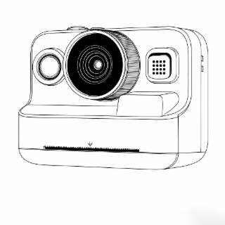 The mark consists of a design depicting a stylized instant camera. The design features a rectangular camera body with rounded edges and a prominent circular lens centered slightly toward the right side of the upper portion. To the left of the lens appears a smaller circular element resembling a secondary lens or viewfinder. To the right of the main lens is a small square-shaped element containing a dotted pattern, suggesting a flash or sensor component. Below the lens, there is a horizontal slit near the bottom of the camera body with a small downward-pointing arrow above it, indicating the film ejection slot.