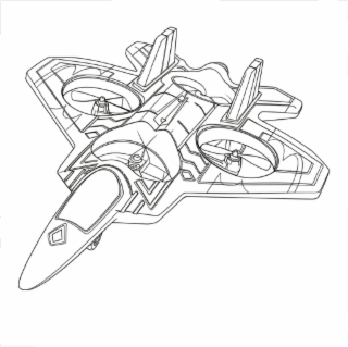 The mark consists of an aircraft resembling a hybrid jet and drone. The aircraft has a sleek, pointed nose with a diamond-shaped design on its surface and a smooth cockpit canopy extending toward the center. The main body features two large circular ducted fan propellers, one on each side of the central fuselage. The wings are angular and integrated into the aircraft’s body, with multiple geometric panel lines and decorative contours. Two vertical stabilizers extend upward from the rear section, with an additional smaller fin structure between them.