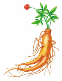 The mark consists of a stylized depiction of ginseng plant design with a yellow and orange ginseng root design at the bottom that features green leaves and green stems at the top of the stylized ginseng root. A single red circular flower design is positioned on the top of the plant, which is connected to a green stem design featured on top of the stylized depiction of a yellow and orange ginseng root.