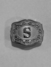 The mark consists of a pendant in the distinct shape of a belt buckle with its specific dimensions and raised filigree design with a smooth oval interior and raised letter of choice in the center in the specific font. The letter "S" is merely a placeholder to demonstrate the font and size that Applicant is also seeking to protect within the trade dress. The letters are interchangeable.