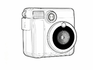 The mark consists of a camera device featuring a generally rectangular body with rounded corners. The front of the design includes a large circular lens centered in the lower portion of the camera, surrounded by concentric rings that represent the lens detailing. Above the lens appears a smaller circular element resembling a flash or viewfinder, positioned slightly to the right of center. To the upper left of the front face is a grid of small dots arranged within a square, suggestive of a speaker or light array. The left side of the camera body features a rectangular protruding element resembling a latch or hinge, with a small rectangular slot or button on its surface. The camera body displays subtle contour lines outlining its shape and corners, giving the appearance of depth and curvature.