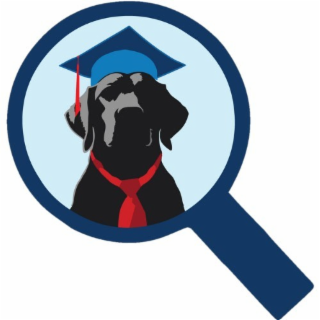The mark consists of a dark blue magnifying glass with the inside of the magnifying glass featuring a black dog with a gray face wearing a red necktie and blue graduation cap with a red tassel against a light blue backdrop representing the glass.