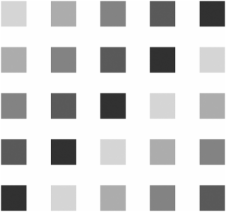 The mark consists of a design of squares in a 5 x 5 grid having a diagonal line of 5 black squares in the center with lines of squares in diminishing shades of grey extending out toward the edges of the grid.