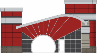 The mark consists of a three dimensional building design consisting of red, gray, and black colored design elements used in combination on an exterior of a conveyorized car wash center, namely: 1. Gray roof trim on each of two towers; 2. Red and Gray upper portions of the façades of the two towers; 3. Red and Gray portions of the façades of the two towers; 4. Gray arched vehicle exits; 5. Red and Gray sunburst design above the vehicle exit; 6. Gray curved roof above the sunburst design; 7. Gray on upper façade on bump out of building; 8. Black and Gray on middle and bottom portions of façade on bump out of building; and 9. Black square pattern below the Red and Gray sunburst design. The dotted lines are not part of the mark but are intended only to show placement of the mark.