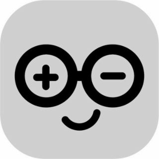 The mark consists of a rounded square containing a smiley face design wearing stylized glasses formed by two circles with a line between them where the left eye is a plus sign, the right eye is a minus sign, and the smile is a curved line.