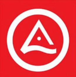 The mark consists of a dot located in the center of a stylized triangle located in the center of a circle on a red field.