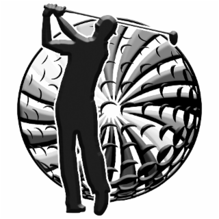 The mark consists of a silhouette of a golfer on the follow through of his swing with a color wheel on a giant golf ball.