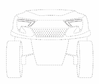The mark consists of trade dress in the form of the specific configuration of the front lighting and grille design for a vehicle. The design features two separate, non-connecting light elements positioned on the upper portion of the front end. Each light element is an angular, segmented shape resembling a checkmark or boomerang, with a primary lower segment forming an acute angle with a shorter upper segment. Between these two light elements and below the main hood line is a distinctive central grille panel characterized by a regular, repeating pattern of small circular perforations or dots. The features shown in dashed lines, specifically the vehicle body, hood, tires, wheel wells, and bumper outlines, are intended to show the positioning and environment of the mark and are not claimed as part of the trade dress.
