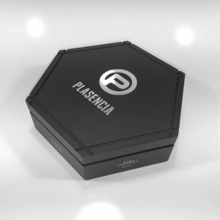 The mark consists of a three-dimensional hexagon-shaped box with a stylized P on top over the word "PLASENCIA", the top of the box having etched lines along the edges in the shape of a hexagon.