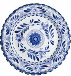 The mark consists of The color blue is a claimed feature of the mark. The mark consists of a three-dimensional trade dress. The mark consists of a stylized design consisting of a flower surrounded by plant likedesigns on three sides encapsulated by a circle of ornate plume leaf and floral designs. The mattershown in broken lines is not part of the mark.