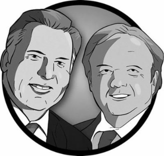 The mark consists of the faces of two male figures, each wearing a collared shirt, suit jacket and tie. All of the foregoing appears within a circular design.