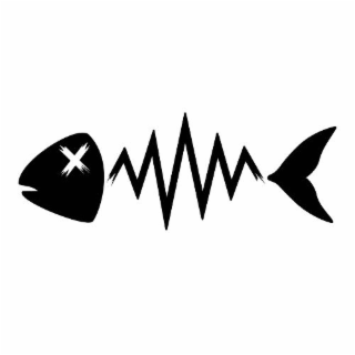 The mark consists of a stylized fish skeleton with an open mouth, an X-shaped eye formed by rough brushstroke lines, a spine composed of jagged zigzag lines, and a tail fin that spreads outward into two curved lobes, each tapering to a slight point. The mark contains no letters, numbers, or words.