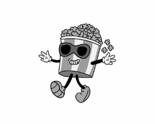 The mark consists of a stylized popcorn bowl with arms, legs and glasses on, its hand are spread out.