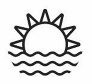 The mark consists of a stylized sun with rays, setting over water represented by three waved lines.