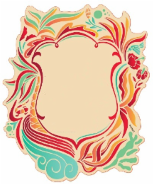 The mark consists of a shield within a design framing the shield, both over a cream background, the frame comprising floral and plant elements in green, orange, and red; wavy elements in orange, turquoise and red; a lizard in orange and red; stylized palm tree with trunk in orange and leaves in green and red; stylized ocean waves in turquoise.
