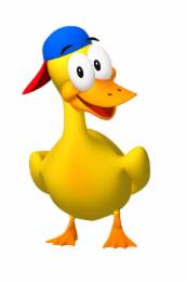 The mark consists of the image of a yellow duck with orange feet, an orange bill with a red tongue. The duck is wearing a baseball cap in blue with a red bill. The eyes are white with black irises and the duck has black eyebrows.