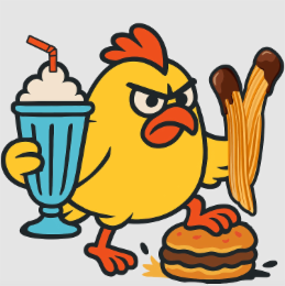 The mark consists of A frowning cartoon yellow, orange, cream-colored, and black chicken holding a cream-colored milkshake in a blue cup and two light brown churros with dark brown chocolate on them. The chicken is stepping on a light brown, orange, and dark brown burger with black sauce coming out of it and a yellow action line emanating from it.