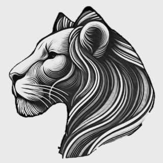The mark consists of a stylized profile of a lioness’ head facing left, her fur is illustrated with flowing, curved lines creating a sense of motion and elegance, emphasizing the contours of the lioness’ face and neck through intricate line work and shading.